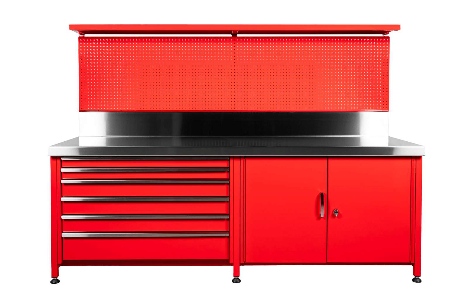 Classic 2400mm Workbench with Six Drawers Extra Large Lockable Cabinets Heavy Duty Pegboard Overhead Shelf Power and Stainless-Steel Top